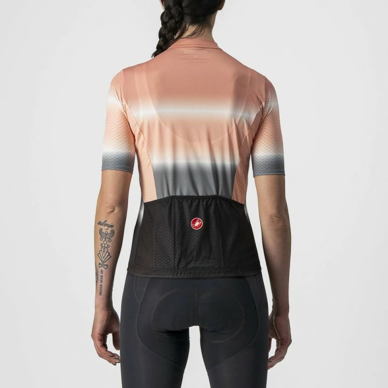 Les dégradés de couleur sont désormais à la mode depuis quelques saisons, mais le graphisme du maillot Dolce Jersey leur insuffle un nouvel élan. Ce maillot est conçu sur le modèle de notre nouveau maillot de base Competizione 2. Nous avons actualisé la conception en faisant se terminer les panneaux latéraux dans les poches. Nous avons actualisé le tissu afin que le dos du maillot ne descende pas trop lorsque vous chargez les poches. Et nous avons actualisé le tissu des manches ainsi que la coupe, en conservant un tissu super extensible pour que le modèle s’ajuste parfaitement sur n’importe quel corps, sans qu’on se sente trop serré.